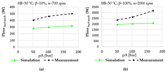 (a) Prediction vs. measurement; hydraulic-mechanical losses of the pump at low power operating condition; (b) prediction vs. measurement; hydraulic-mechanical losses of the pump at high power operating condition.