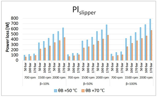 Total power losses in slipper/swash plate interface at different operating conditions.
