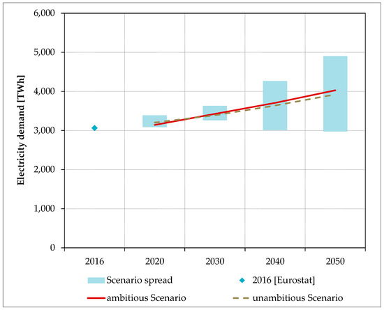 Figure 1 shows the development of electricity demand in the unambitious and the ambitious scenario when compared to the scenario spread that results from the scenarios TYNDP 2018 [5], the study eHighway 2050 [29], EU Vision Scenario 2017 [30], and the EU Reference Scenario 2016 [31]. During the period up to 2050, most of the scenarios show a significant increase in demand, which can be attributed to an overcompensation of efficiency measures by an increase of new electricity consumers, such as electric mobility or heat pumps. The unambitious and ambitious scenarios show a relatively similar trend for electricity demand and are in the midfield of the scenarios considered. Compared to 2016, the electricity demand increases by 28% in the unambitious scenario and by 31% in the ambitious one.