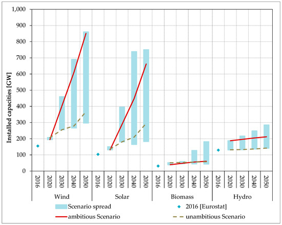 Figure 2 shows the development of generation capacities for wind, solar, biomass, and hydro power in the unambitious and the ambitious scenario compared to the scenario spread that results from the scenarios TYNDP 2018 [5], the study eHighway 2050 [29], EU Vision Scenario 2017 [30], and EU Reference Scenario 2016 [31].