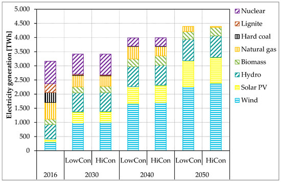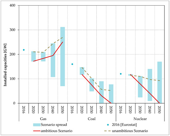 Figure 3 shows the development of the conventional generation technologies natural gas, coal, and nuclear power in the unambitious and the ambitious scenario when compared to the scenario spread that results from the scenarios TYNDP 2018 [5], the study eHighway 2050 [29], EU Vision Scenario 2017 [30], and the EU Reference Scenario 2016 [31]. In most scenarios, natural gas capacities show a slight decline over the next few years, which is followed by an increase until 2050 to provide for sufficient secured capacity. In the ambitious scenario, natural gas capacities in 2050 are approximately 15% above today’s level. In the unambitious scenario, natural gas capacities increase by approximately 25% compared to today’s level.