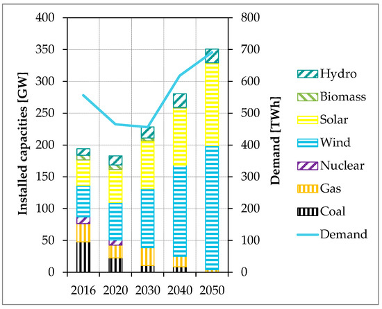 The assumptions on the development of the German electricity market are based on scenario Klimaschutzszenario 95 (KS 95) from Reference [28]. Figure 4 shows the development of installed capacities and electricity demand for Germany. In order to end up with a more ambitious scenario in our analysis, we decided to further reduce the coal capacity for 2050 from 2.7 GW to 0 GW compared to the original scenario values. The nuclear phase-out [34] will be completed before 2030. By the year 2050, the installed wind capacity is expected to increase by a factor of 4 compared to the 2016 level and the solar capacity is expected to triple during this period. While biomass in the electricity sector will be of less importance, it is assumed that the installed capacities of hydro power (run-of-river and pumped storage) will double by 2050. Efficiency measures will dominate the development of electricity demand until 2030. After that, the demand for electricity will rise again due to new consumers such as heat consumers and electric mobility and will be about a quarter above the current level in 2050.