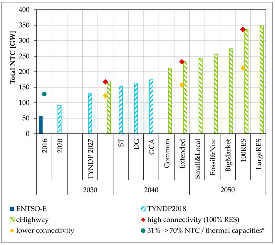 Development of total NTC in the ENTSO-E area [5,29]. *Increase of the NTCs due to a higher NTC to thermal grid capacity ratio: 2016: Ø 31% [38], 2025: min. 70% [39].