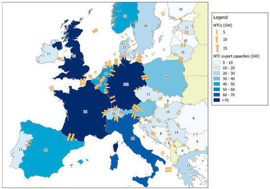 NTCs between the countries considered and their sum of export capacities in the high connectivity scenario for the year 2050. Source: Reference [29].