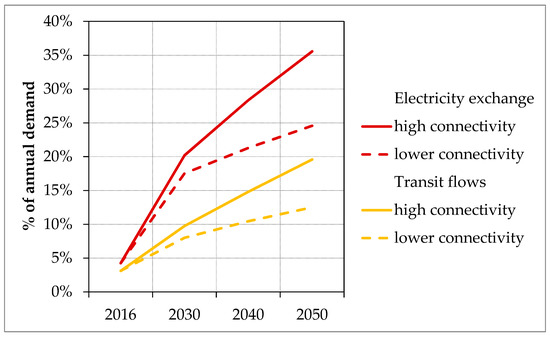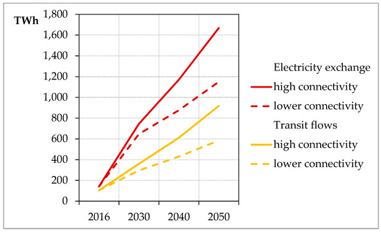 Figure 8 shows the development of electricity exchange between the modeled ENTSO-E countries and the transit flows for the lower connectivity and the high connectivity scenarios. As an indicator for electricity exchange, the sum of export flows between countries in the ENTSO-E area that was used. In line with the significant increase in NTCs, electricity flows between countries grow significantly in the scenario years. In the high connectivity scenario, the values increase to 12 times of the 2016 level by 2050. In the scenario year 2030, the reduced interconnection causes a 13% reduction in the European electricity exchange. In 2040, the reduced interconnection leads to a 25% reduction, and, in 2050, it brings a 31% reduction.