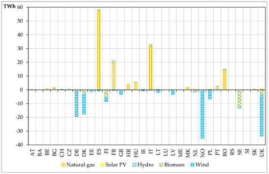 Figure 11 shows the change in electricity generation that results from the lower connectivity for the year 2050 on country levels. As already described in Section 3.1, the reduction in electricity exchange leads to an increased utilization of domestic electricity sources. It can be seen that the lower level of interconnectivity restricts trans-European exchange so that, in Northern Europe and Germany, renewables have to be curtailed and biomass capacities are used less, while, in Southern and Central Europe, natural gas power plants (and, in very small amounts, also biomass capacities) have to generate more electricity. Norway shows the largest decrease in RES-E integration. This can be attributed, in particular, to a significant reduction in electricity exports to Germany and the Netherlands (approximately 30%). Spain has the largest increase in electricity generation from natural gas-fired power plants. This can be attributed, in particular, to a reduction of approximately 70% of electricity imports from France.