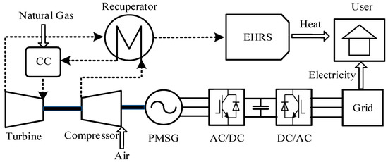 The basic structure of the grid-connected MGT generation system used for the CHP application is shown in Figure 1. The process of energy conversion can be expressed as follows: First, the natural gas and the compressed air enter the combustion chamber. They are mixed and combusted to generate high-temperature gas carrying thermal energy. Then the high-temperature gas enters the turbine, and part of the thermal energy is converted to mechanical energy and generates electricity. The exhaust gas of the turbine further enters the exhaust heat recovery system (EHRS) and becomes the heat available to customers.