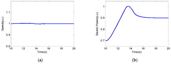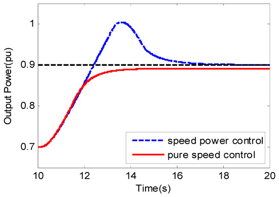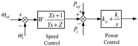 The block diagram of the integrated speed and power control is shown in Figure 2. In Figure 2, and are speed reference value and the power instruction respectively; and are the measured speed and the output power respectively. , , and are parameters for the speed controller; and are parameters for the power controller. As shown in Figure 2, power control is added to the system, forming a double-loop control: The outer loop of the speed and the inner loop of the power. The former is modeled by a proportional lead-lag transfer function, while the latter is realized by a PI controller. With such power control, not only zero error of rotor speed and power can be realized, but also the quantity power error can be compensated to a considerable extent, which will be introduced in detail in the following section. In addition, it is noted that the PI parameters have a great impact on system response and performance. When the PI parameters are set as , the integrated speed and power control are equivalent to pure speed control.