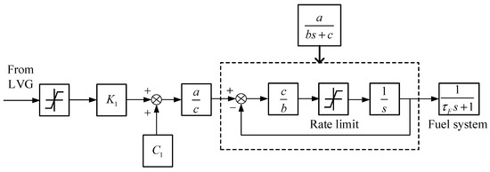 The fuel control system, including the fuel rate change limit, is shown in Figure 3. In Figure 3, and are the gain of the fuel limiter and the constant for compensating the consumption of the compressor respectively; , , and are parameters of the valve positioner; is the time delay of the fuel regulator. The output of the least value gate passes through the limit function to constrain its magnitude within the maximum and minimum range. The maximum limit is enabled when the turbine is overheating, which is determined by the maximum acceptable temperature in the MGT. By contrast, the minimum limit is chosen to maintain that sufficient fuel flows into the gas turbine combustion system to ensure the flame maintained. It is a “hard” constraint and typically set at approximately 10% of a torque deficiency [16]. The fuel control system consists of a valve positioner and a fuel regulator. The input to the integrator represents the rate of valve opening, where a limit is imposed to constrain the rate of power change. The fuel flow of the fuel system is decided by the inertia of the fuel system regulator, and the equivalent transfer function is shown in Figure 3.