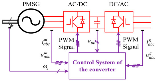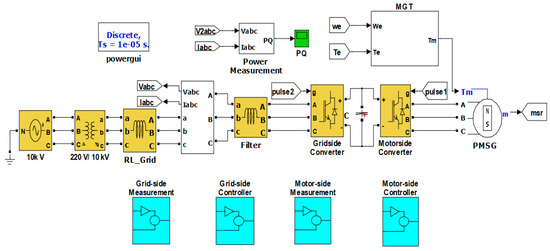 The power generation unit is mainly composed of a permanent magnetic synchronous generator (PMSG) connected with the MGT turbine and a bidirectional back-to-back converter. The motor-side converter (AC/DC converter) and the grid-side converter (DC/AC converter) respectively control the electric power generated by the PMSG and the voltage and the frequency fed into the grid, which are the core components of the electric energy conversion process. This section mainly introduces two parts: The improved MGT model and the control model for the back-to-back converter, and the rest of the system is similar to Reference [30].