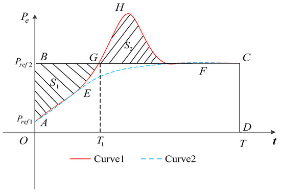 The X-axis represents the operation time, and the Y-axis represents the electricity output of CHP. Supposing the power instruction change from to and the regulation process proceeds from to . With some PI parameters, the power response curve could be Curve1 in which the electricity error between the reference and actual value is the area of ABFEA. With some PI parameters, however, the response curve could be Curve2, and the electricity error can be compensated by the overshoot from to . The objective is to minimize the difference between area ABGA and area GHFIG, which is equivalent to making (1) holding during the period T.
