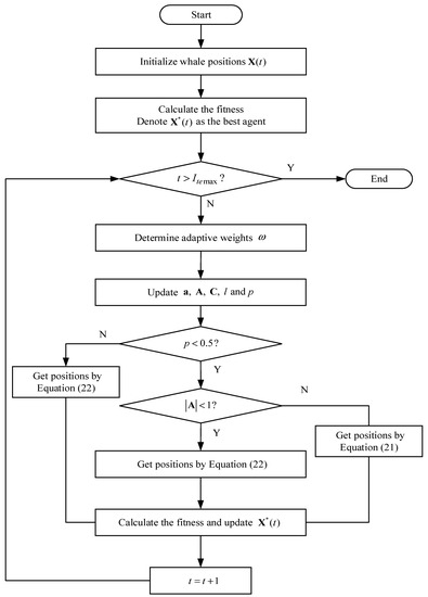 The Whale Optimization Algorithm (WOA) was proposed by Mirjalili S and Lewis A in 2016 [27]. It is assumed that whales are the most intelligent animals containing motion and WOA is a swarm-based optimization method motivated by the specific hunting behavior of humpback whales. According to Reference [27], WOA is more competitive than PSO in both exploration capability and exploitation capability.