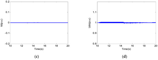 The grid-side converter mainly controls the active and reactive power of the grid-connected point, and ensures the stability of the DC bus voltage. In this paper, the decoupling control strategy based on the DC bus voltage is considered for the grid-side converter. The decoupling control can effectively control the active and reactive power, and the converter voltage can be realized through the phase-locked loop so that the frequency and phase are strictly synchronized with the grid. Based on this strategy, another double closed-loop control is considered, in which the outer loop is the DC voltage loop, and the inner loop is the current loop. The control block diagram is shown in Figure 5b.