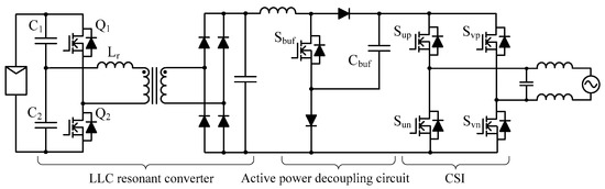 On the other hand, the LLC resonant converter is also one choice for the isolated DC/DC converter, because it has good performance to reduce the switching losses utilizing Zero Voltage Switching (ZVS) and Zero Current Switching (ZCS) by series resonance [4,5,6,7,8,9]. In particular, the parasitic capacitor is discharged before being turned on by the negative current. On the other hand, each drain current approximately becomes zero when each switch is turned-off, owing to the sinusoidal resonance current. That means the turn-on and the turn-off switching losses are drastically reduced by the ZVS and ZVS operation. In addition, the volume of the transformer is drastically reduced owing to the high switching frequency operation being same as the push-pull converter or flyback converter. Note that in the single-phase AC grid systems, a double-line frequency ripple occurs in the input current due to the single-phase AC grid, and the current ripple decays the performance of the MPPT because the PV generative power becomes unstable. Therefore, the bulky electrolytic capacitor is usually installed on the DC side. However, the bulky electrolytic capacitor may limit the lifetime of the power converter because the micro-inverter has to operate on the high environmental temperature condition although the lifetime of the electrolytic capacitor depends on the Arrhenius law. In order to solve this problem, the active power decoupling topologies have been studied to compensate the current ripple [10,11]. These topologies utilize the small capacitor such as a firm or ceramic capacitor for the power decoupling. Thus, an electrolytic capacitor is not necessary.