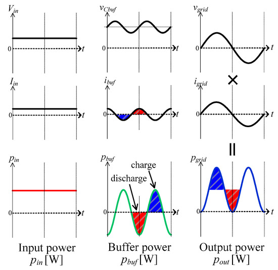 Figure 3 shows the principle of the power decoupling between the DC and single-phase AC sides [14]. In this system, the sinusoidal inverter output current is generated by the power converter in order to transfer the power to the single-phase AC grid. In this case, the single-phase grid voltage and the inverter output current are expressed as