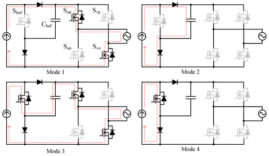 The operation of the active power decoupling circuit cooperates with the CSI; this achieves both power decoupling and power transmission to the single-phase AC grid. In mode 1, the switch Sbuf is turned on, and the input power is transferred to the single-phase AC grid. In mode 2, all the switches are turned off, and the buffer capacitor is charged. In mode 3, the buffer capacitor is discharged through the Sbuf and CSI. Finally, mode 4 is the free-wheeling mode. The buffer capacitor voltage is regulated to adjust the duty command for modes 2 and 3 on the one period of the triangle carrier.