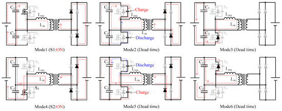 Figure 5 shows the operation mode, and the Figure 6 shows the key waveforms of the LLC resonant converter. In this circuit, the series resonance of C1, C2, and Lres is utilized for soft switching. The LLC converter regulates the input voltage of the active power decoupling circuit. The detail of the operation mode is as follows.