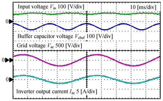 According to Figure 7, the constant DC voltage and the sinusoidal inverter output current with the low THD are obtained. In addition, it is obtained that the buffer capacitor voltage is fluctuated by the double-line frequency by the power decoupling control. However, the low frequency component is still remaining on the input voltage. This is because the mismatch is occurring during the compensation value and the actual power ripple component. The compensation value for the power decoupling is obtained from the input power. However, the input power is included the conversion loss, which means the error between the compensation power and the actual output power occurs. This problem is solved by changing the calculation process of the compensation value to use the output power condition.