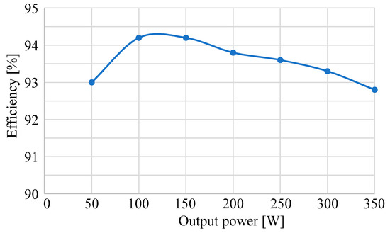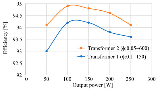 Figure 9 shows the efficiency characteristics and the loss analysis result of the LLC resonant converter. According to Figure 9, 94.3% of the maximum efficiency is obtained when the output power is 100 W. In order to improve the conversion efficiency, the utilization of the synchronous rectifier is simple solution. On the other hand, the reduction of the transformer losses is important for the high switching frequency DC/DC converter because the copper loss becomes largely due to the skin effect and the proximity effect [15].