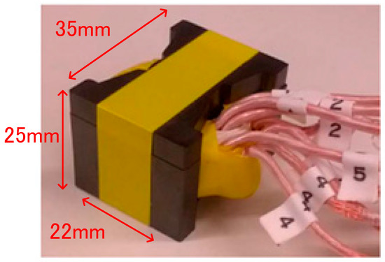 Figure 10 shows the overview of the transformer, and Table 3 and Table 4 show the parameter of the two transformers. Note that the air gap is not provided on this transformer in order to eliminate the leakage flax from the air gap, and the ferrite core with low eddy current loss is selected for the high switching frequency operation. The difference between two transformers is only number of strands, with transformer 2 having many strands on the wiring.