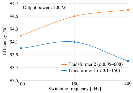 Figure 11 shows the comparison of the conversion efficiency when the number of the strands is changed. Note that the orange and blue line means the approximate curve of each plot. The switching frequency is set to 200 kHz, and the same transformer core material is used. In this experiment, the conversion efficiency of the LLC converter with difference number and diameter of strands as shown in Table 3 is compared. According to Figure 11, it is obtained that the conversion efficiency is improved by 1% when the number of strand is increased on the wiring. This is because the increasing AC resistance due to the skin effect is suppressed, and the copper loss is reduced. Therefore, the litz wire with a lot of strands has a good performance in order to improve the conversion efficiency for the high switching frequency converter. Note that Figure 12 shows the comparison of the conversion efficiency when the switching frequency is changed. Note that the orange and blue lines represent the approximate curve of each plot. According to Figure 12, it is obtained that the improvement rate of the conversion efficiency is increased at 200 kHz. From this result, the number of strands should be chosen accordingly because it depends on the switching frequency.