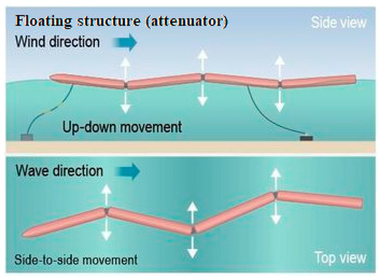 Floating structures: Unibody or multibody structures moving in heave, pitch, roll or in any combination of the three (Figure 3) when affected by a wave. The relative movement between different parts of the device allows converting it into electricity. These kinds of devices are rarely named as floating structures but using the dimensions with respect to the wave: attenuators or floating-point absorbers. Multiple examples can be found for this kind of technology. Pelamis was an attenuator floating structure deployed during 2007. The machine is composed by a number of semi-submerged, linked sections. These sections move relatively when the waves pass along the length of the machine. W1 is a point absorber floating technology deployed in 2014. The machine has two main bodies linked without restrictions in heave motion, which allows the relative movement between them.