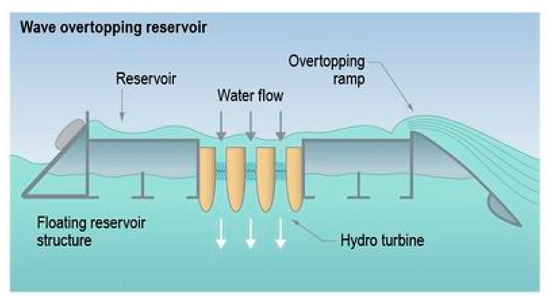 Overtopping devices: These devices collect the water from the incident waves into a reservoir in order to move one or more reduced jump hydraulic turbines, usually Kaplan turbines. They take advantage of the potential energy of the waves to convert it, through synchronous generators, into electrical energy (Figure 5). Within this type of device, we can distinguish between converters with a fixed structure located on the coast (onshore) and those with a floating structure far away from it (nearshore–offshore). A common example of these kind of devices is the Wave Dragon [23], which is characterized by having a reflector that directs the incident waves towards a ramp to the reservoir above sea level.