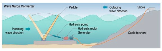 Oscillating wave surge: These devices typically have one end attached to a fixed structure or the bottom of the sea while the other end is free to move. A hinged deflector, this part is positioned perpendicular to the wave direction, terminator (Figure 6). The axis of the deflector (or paddle) oscillates like a pendulum mounted on a pivoting joint in response to the impact of the horizontal movement of the wave particle. They often come in the form of floats, fins or membranes. This working principle could be associated to the unique Japanese ‘Pendulor’ system [24]; but these devices do not take advantage of any harbor resonance. An example for this kind of technology is the Aquamarine Power Oyster, a nearshore device, where the top of the deflector is above the water surface and is hinged from the sea bed.