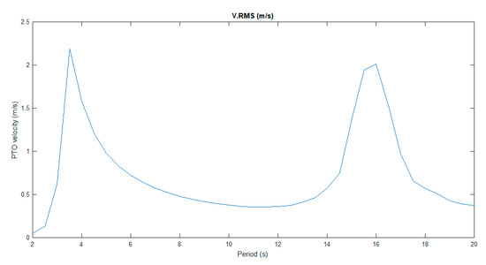 Variation of WEC oscillator velocity (no PTO) for a set of regular wave frequencies with Reference Model 3 [29] geometry with minor variations; simulations performed in WECSIM [30]. Natural resonance operation found for periods of 3.8 s and 16.4 s.