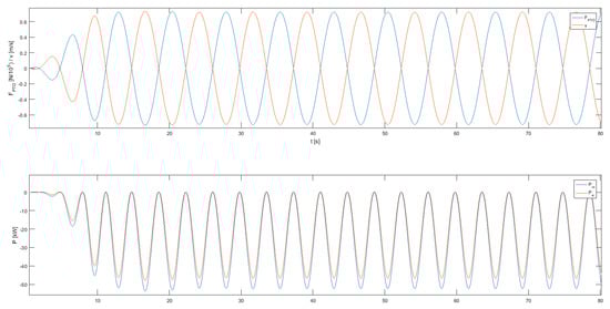 Linear damping–WEC simulation for regular waves. In the upper graphic PTO force (blue) is compared with PTO velocity (red). The lower graphic represents ideal power output (blue) and power output considering electrical losses (red); negative values for power means the WEC is delivering energy to the grid.