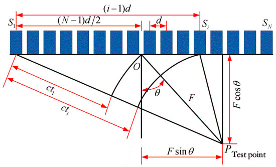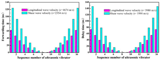 Figure 7, when the installation space of each ultrasonic transducer was 60 mm, the ultrasonic frequency was 40 kHz, and the focusing point was 560 mm from the centre of the linear array vibrators. The advance time of each ultrasonic transducer was calculated for different wave velocities and different materials. With an increase in the wave velocity, the advance time decreased. The advance time of each vibrator was calculated using Equation (6). Finally, with respect to the deflection of the focused beam, the distance between the focusing point and each vibrator was calculated, and the advance time was subsequently determined according to the distance.