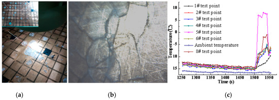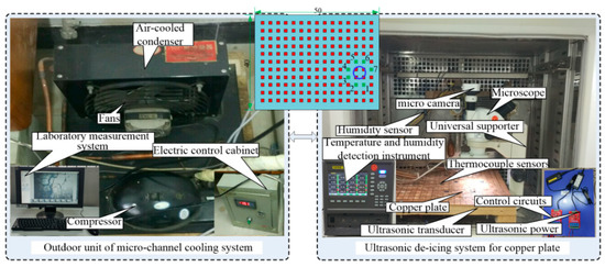 Figure 13c, when the ultrasonic transducers were opened and the ambient temperature in the cabinet remained unchanged, the test point on the copper plate surface experienced a sudden increase in temperature, and the temperature increase was more evident if the test point was near the ultrasonic transducer. The analysis results indicate that the ultrasonic energy was focused at the interface between the copper plate and frozen droplets owing to the difference in the material parameters of the copper and ice, and the ultrasonic energy focusing increased the interface temperature. Simultaneously, the frozen droplets were under the effect of high-frequency alternating stress and temperature increases, and a thin water film formed at the interfaces. As time passed, the thickness of the water film increased under ultrasonic cavitation until the frozen droplets were completely removed. Finally, the Lamb wave and SH wave excited by the ultrasonic vibration in the copper plate were responsible for ice layer cracking and delamination; thus, the cracking of frozen droplets initially occurred, and the frozen droplets subsequently shifted under ultrasonic vibration. Therefore, the main mechanism of the removal of frozen droplets was related to perpendicular stress excited by the Lamb wave exceeding the tensile strength of the ice, which caused the cracking of the frozen droplets. Additionally, the differential transverse shear stress at the interface was generated by the SH wave, owing to the wave velocity differential, and the heating effect at the interface was produced by ultrasonic guided waves because of the concentration of energy. This increased the water-film thickness and caused shifting due to the ultrasonic cavitation effect and shear stress. Hence, the combination of the ultrasonic stress effect and cavitation effect was the main reason for the ice layer removal.