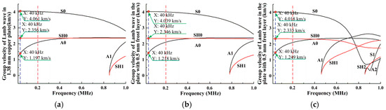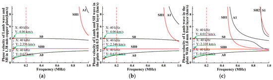 Figure 6 illustrate the phase and group velocities of the Lamb wave and SH wave in a vibration transfer plate with different frost layer thicknesses. There were three types of guided wave modes in the vibration transfer plate when the excitation frequency was <200 kHz; the A0 and S0 modes of the Lamb wave and the SH0 mode of the SH wave. A comparison of the three types of guided wave modes indicated that the dispersions of the S0 mode and SH0 mode were smaller than that of the A0 mode. Therefore, the S0 and SH0 modes were selected for phased array focusing, because the vibration amplitude of the wave packet decreased quickly with an increase in the dispersion.