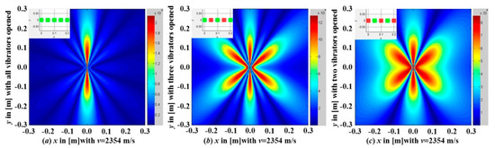 Figure 8a, when the installation intervals of each ultrasonic transducer were 50 mm and all transducers were opened, there were five ultrasonic focusing beams in the XY plane, and each focusing beam was symmetrically distributed along the X and Y axes. Additionally, the strongest area of focusing for the ultrasonic field was at the location of the middle transducer, owing to the ultrasonic directivity characteristic, and the strongest focusing field exhibited a radial distribution. Furthermore, the other ultrasonic focusing beam was symmetrically distributed on both sides of the strongest focusing beam, and an angle related to the wave velocity and installation intervals of the ultrasonic transducer was formed between the beam centre axis and the coordinate axis. A comparison of