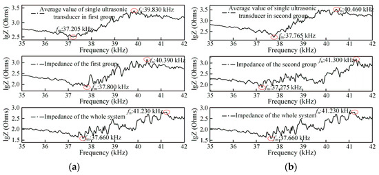 Figure 10 illustrates the impedance of a single ultrasonic transducer, the average impedance of a single transducer for each group, the impedance of each transducer group, and the complete system impedance variation with respect to the frequency when the ultrasonic transducers were in a free condition or fixed on the copper plate. As illustrated in