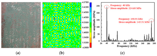 Figure 12a,b indicates that when six transducers were fully operated, the measured vibration shape and the stress distribution characteristics of the finite-element calculation on the copper plate surface were similar without consideration of the energy dissipation. Furthermore, the actual vibration shape and simulated stress distribution on the copper plate surface were approximately wave-like, an evident superposition phenomenon appeared in a certain region, and the positive and negative stress regions appeared alternately. The analysis results indicate that when multiple ultrasonic beams excited by the ultrasonic transducers propagated in the copper plate, the wave groups were mutually superposed on the copper plate surface through reflection and refraction with the interface. According to the principle of wave superposition, when multiple ultrasonic beams are superposed on each other with identical or similar frequencies, the vibration amplitude increases in certain areas along the wave propagation direction, while it decreases in other areas, even forming a standing wave. In the visualisation experiment of the ultrasonic vibration energy distribution, small sand particles were maintained as beating and could not remain in certain regions of the copper plate surface, while in other regions, the small sand particles were essentially motionless and simply moved slowly to the area under the influence of ultrasonic vibration. Therefore, the vibration-strengthening areas and vibration-attenuation areas that formed on the plate surface appeared alternately, and corresponding stress-strengthening and stress-attenuation areas were formed on the copper plate surface.