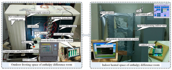 Figure 14 illustrates photographs of the defrosting experiment involving the ASHP unit installed in an enthalpy laboratory, which included a temperature and humidity recorder (the measurement accuracies for the temperature and RH were 0.2 °C and 2%, respectively, and the measurement ranges were −40 °C to 100 °C and 20% to 98%, respectively), a frost layer thickness measuring system (with an accuracy of 0.01 mm), a laboratory measurement system (the measurement accuracies for the temperature and RH were 0.1 °C and 1%, respectively, and that for the power consumption was 0.5 W), and control circuits.