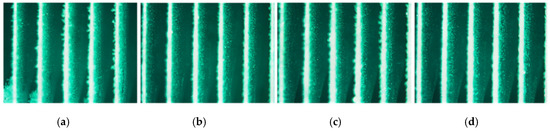 Figure 15. A comparison of the microscopic images of the fin frost indicated that the thinnest frost layer occurred in mode III (mode I: without ultrasonic vibration; mode II: intermittent 50 s, vibration 10 s; mode III: intermittent 110 s, vibration 10 s; mode IV: intermittent 170 s, vibration 10 s; mode V: intermittent 230 s, vibration 10 s), and the thickest frost layer occurred in mode V. The results indicate that more energy was input to the evaporator under the working conditions of the ultrasonic array transducers, which compensated for the energy dissipation during the ultrasonic transfer process and increased the effective defrosting area. Furthermore, the density of the stress-concentration regions increased owing to reflection and refraction wave superposition, which explains the thin basic frost layer on the fin surface.