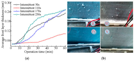 Figure 16b, only a few frost heap residues remained on the evaporator surface, and the changes in the trend of the frost layer thickness matched the amount of frost removed from the evaporator. In summary, without considering the effects of the operation environment and measurement error, the defrosting dead angle was eliminated using the intermittent ultrasonic array defrosting method and did not realise the frosting operation of the ASHP unit.