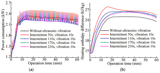 Figure 17 illustrates the energy consumption and heating capacity in different intermittent ultrasonic vibration modes. As shown, the power consumption of the ASHP unit rapidly increased at the initial operation stage, and subsequently reached a steady state. Furthermore, under different ultrasonic loading modes, the power-consumption peak of the ultrasonic array system appeared on the power curve at each corresponding intermittent time, and the peak value was approximately 210 W. The rated power of the ultrasonic transducer was 50 W, and the corresponding rated power of the ultrasonic array system was 250 W. The experiment results indicate that there were differences in the actual work frequencies of the ultrasonic transducers due to installation inconsistencies, and the single power supply was significant such that each ultrasonic transducer was in the resonance condition. Thus, the actual power consumption was smaller than the rated power consumption.