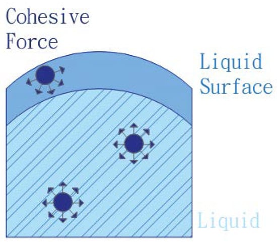 Surface tension is a physical effect, as shown in Figure 1. In the microscopic world, short-range attraction exists between molecules. Molecular attraction between the same kinds of molecules is known as cohesion. The attraction between liquid molecules is greater than the attraction of gas to gas molecules or liquid to gas molecules, so when the contact surface of a liquid and a gas cannot maintain a balanced state, the tensile force within the liquid propels the liquid surface into the smallest area possible. This makes the liquid surface look like it is covered with a layer of elastic film, which means that there is surface tension acting in the direction of the surface tangent.
