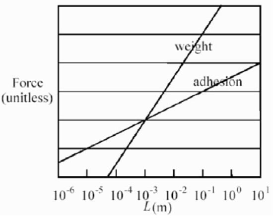 According to the above equation, surface tension, in units of N/m, will rise as the temperature drops and vary with different contact surfaces. Surface tension decreases as size shrinks, and this main characteristic is often encountered in tiny devices. Figure 2 illustrates the comparative relationship between gravity and adhesion for various sizes of liquid surfaces. The figure clearly shows that when the length of the object is less than one millimeter, the effect of surface tension is greater than that of gravity, which means that liquids at this level become attached to the object because the adhesive force can resist the pull of gravity [].