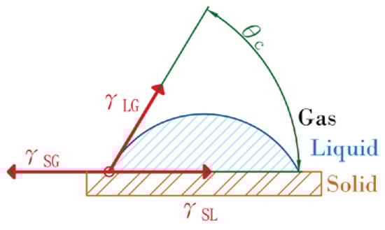 In 1805, Thomas Young first proposed the concept of the contact angle []. As shown in Figure 3, when a droplet falls on an ideal flat surface, the droplet’s peripheral line will be affected by three-phase interfacial tension. When the forces are balanced, the angle between the solid surface and the tangent of the droplet is the so-called surface contact angle.