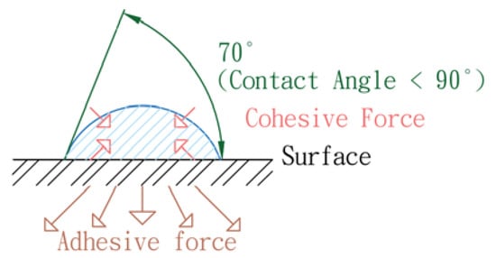 As shown in Figure 4, the droplets are hemispherical or elliptically attached to the surface and occupy a part of the surface volume on the solid surface. Since the adhesive force is greater here, the contact angle is less than 90°, which means that liquids have a higher wettability and will spread on the surface.