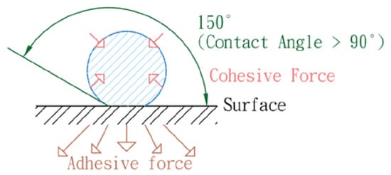 As shown in Figure 5, the droplets attached to the surface are spherical. Since the adhesive force is smaller here, the contact angle is greater than 90°, which means that liquids have a lower wettability with a smaller contact area.