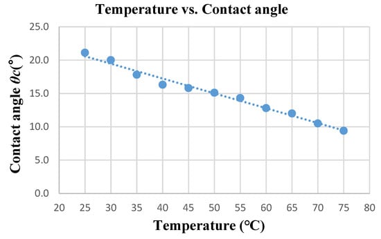 Linear regression, as seen in the above diagram, was used to draw the trend line and find the equation below. The relationship between the fluid with tooling temperatures at 25–75 °C and the contact angle is as follows: