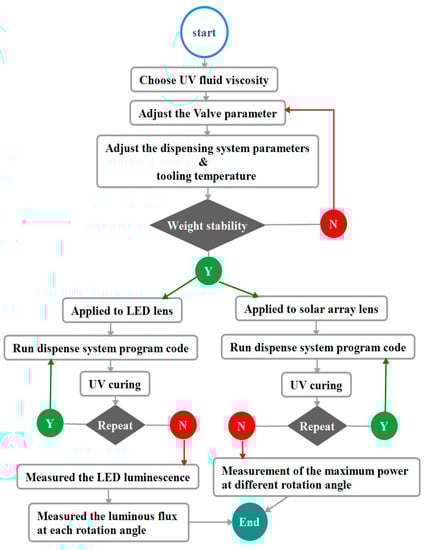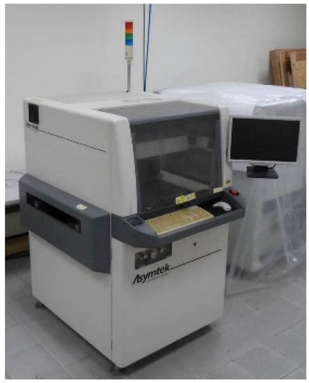 The Asymtec Axiom X-1020 [] dispensing system model (Asymtec, Carlsbad, CA, USA) was used in this work, as shown in Figure 8. The dispensing system is commonly used in semiconductor mass production. It is suitable for bottom filling, gun filling, wafer bonding, and sealing. The system can achieve results high in precision and repeatability, and it is therefore suitable for mass production. It is widely applied to a variety of adhesive materials, production technologies and substrates used in the semiconductor packaging and assembly process [,].