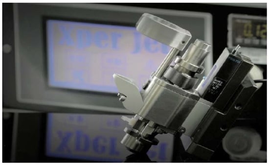 Figure 9 depicts the jet valve, which is normally closed and uses a reflexive mechanism that is driven by compressed air. It uses the momentum conversion principle to squeeze out a precise amount of fluids. A high speed cylindrical coil used to adjust the compressed air acts on the base of the needle assembly. The liquid flows through the base after entering the adhesive tank. When air is exhausted, the needle moves rapidly to the closed position and dispenses the fluid through the nozzle to eject droplets. The continuous flow of droplets can be dispensed in a large volume or according to a specific shape.