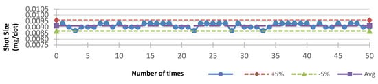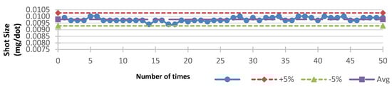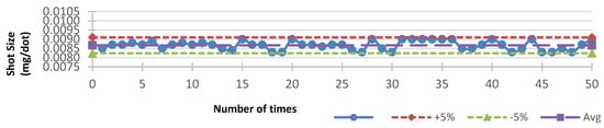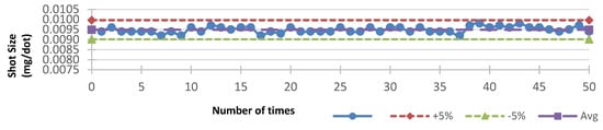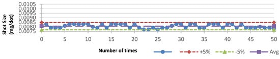 To determine the combination of the jet valve and its parameters in order to dispense fluids steadily, the error rate of each single point weight—which was calculated based on the formula above—should not have exceeded ±5%, as shown in Figure 11, Figure 12, Figure 13, Figure 14 and Figure 15. One factor we were trying to avoid was the surface of the lens becoming stepped, because power would become lost. Comparing Figure 11, Figure 12, Figure 13, Figure 14 and Figure 15, we can see that the lower the viscosity, the higher the weight stability; additionally, the surface of the lens was less stepped. Figure 15 reflects results occurring after we heated the nozzle head to increase the weight stability, but, as predicted, the higher viscosity caused an increase in the stepped surface.