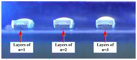 Since the lens array focuses sunlight, it can enhance the intensity of solar radiation emitted using the solar cell. It can also indirectly reduce the reflection of sunlight and increase the possibility of secondary reflection. Figure 19a shows a dispensing path with spacing distance x (mm) of the n-th layer. As shown in Figure 19b, a UV fluid of CP2000 viscosity was dispensed on the glass at spacing distances of x = 1 mm (x_1), x = 1.5 mm (x_1.5) and x = 2 mm (x_2) to form a lens array as a solar cells mask (shown in Figure 19c), and the tooling was controlled at a temperature of 30 °C. The lens was stacked for n layers to increase its height and the contact angle. After curing, an image measuring instrument was used to observe and measure its surface contact angle , width, and height, etc. Table 2 shows the lens shape and size values of different layers (n = 3, 10 and 15) but the same spacing distance (x = 2 mm).; the measurement system of the maximum power of the solar cell for different rotation angles is sho in Figure 20. Figure 21 shows the relationship between the rotation angle and its maximum power for solar cells with different lenses. The top and side view of the three different spacing distances (x = 1 mm, 1.5 mm, and 2 mm) all with the same thickness (n = 3) of lens array are shown in Table 3.